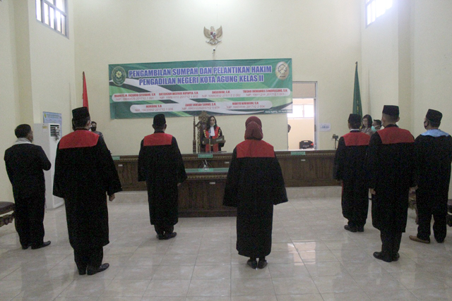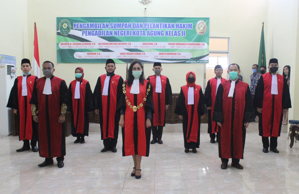 Pada hari Kamis tanggal 23 April 2020 Pukul 10.00 WIB. bertempat di Ruang Sidang Utama Pengadilan Negeri Kota Agung, Ibu Ratriningtias Ariani, S.H. selaku Ketua Pengadilan Negeri Kota Agung telah melantik Sdr. Maurits M. Ricardo Sitohang, S.H., Sdr. Bicterzon Welfare Hutapea, S.H., Sdri. Anggraini, S.H., Trisno Jhohannes Simanullang, S.H., Sdr. Murdian, S.H., Sdr. Zakky Ikhsan Samad, S.H. dan Wahyu Noviarini, S.H. Acara dibuka dengan pembacaan Surat Keputusan Ketua Mahkamah Agung RI, kemudian para Hakim yang akan dilantik mengambil tempat dengan di dampingi oleh Saksi-Saksi dan Rohaniawan.