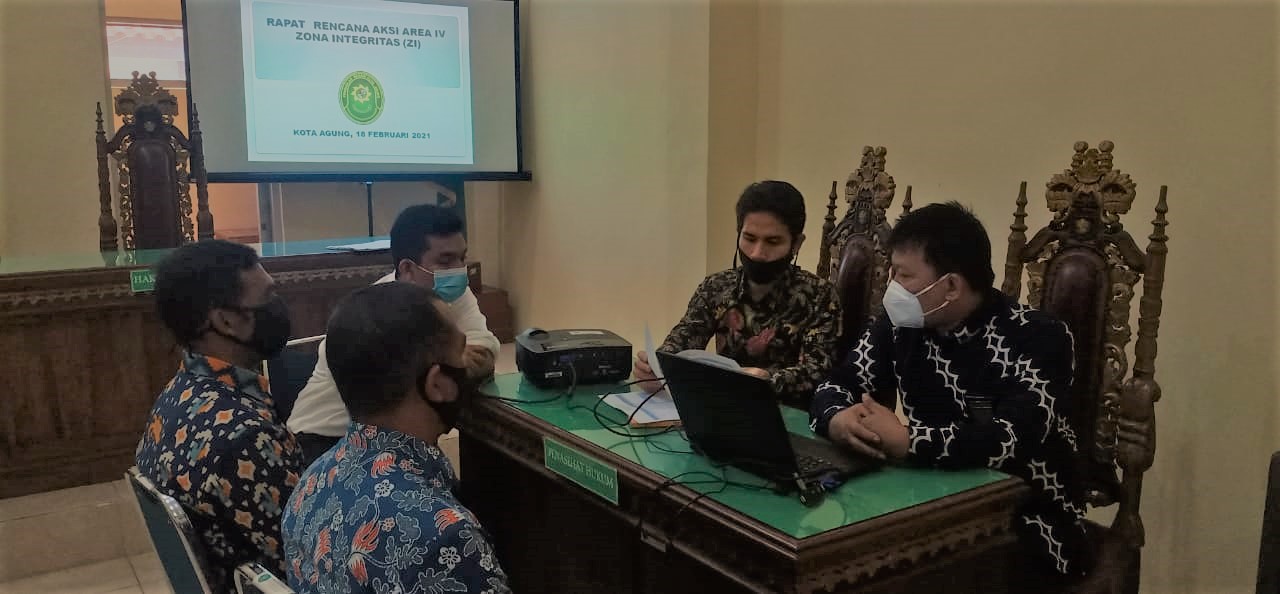 PN-Kota Agung, Februari 2021 telah dilaksanakan rapat monitoring dan evaluasi masing-masing area (Area I - Area VI) dengan agenda pembahasan monitoring dan evaluasi dan tindak lanjut zona integritas (ZI) dan rencana aksi kegiatan tim kerja