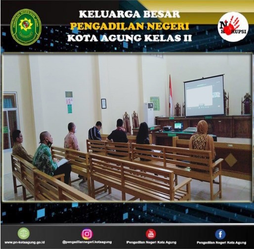 Kota Agung, 9 April 2021| Pada hari Jum'at tanggal 9 April 2021, di ruang sidang utama Pengadilan Negeri Kota Agung, Ibu Ratriningtias, S.H. selaku Ketua Pengadilan Negeri Kota Agung beserta para Hakim, Panitera dan Sekretaris mengikuti Pembinaan Bidang Teknis dan Administrasi Yudisial oleh Pimpinan Mahkamah Agung Republik Indonesia secara virtual. Kegiatan tersebut diikuti oleh Pengadilan Tingkat Banding dan Pengadilan Tingkat Pertama di seluruh Indonesia melalui aplikasi zoom.