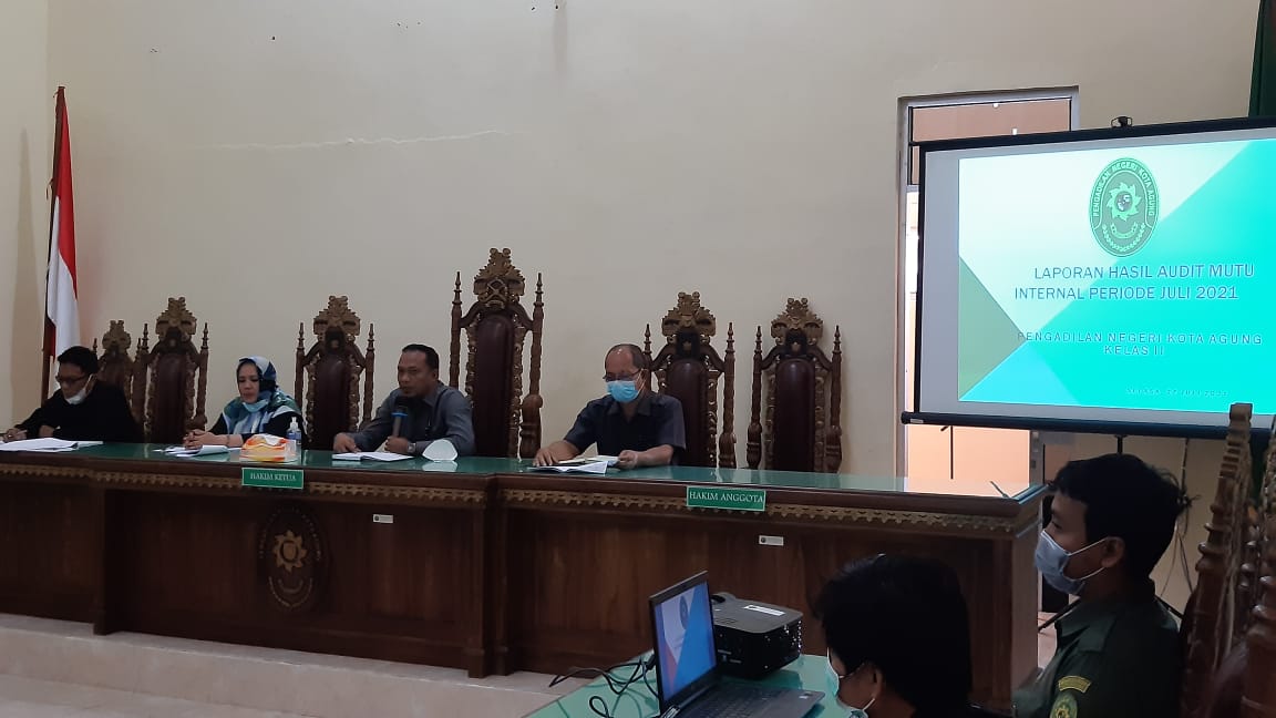 Kota Agung, 27 Juli 2021| Pengadilan Negeri Kota Agung menggelar kegiatan Closing Meeting Assessment Internal Akreditasi Penjaminan Mutu (APM) yang dilaksanakan di Ruang Sidang Utama Pengadilan Negeri Kota Agung pada hari Selasa (27/07/2021) dimulai pada pukul 10.30 WIB. Kegiatan ini dihadiri oleh 4 pilar pimpinan, tim assessor internal dan seluruh pegawai Pengadilan Negeri Kota Agung.