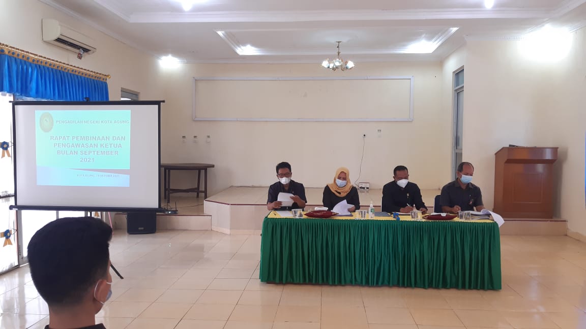 Kota Agung, 19 Oktober 2021| Dalam rangka pembinaan dan pengawasan di Pengadilan Negeri Kota Agung pada hari Selasa, 19 Oktober 2021 telah dilaksanakan rapat rutin bulanan antara Pimpinan Pengadilan Negeri Kota Agung dengan seluruh Hakim, Panitera, Sekretaris, Panmud, Kasubbag, Panitera Penganti, Juru Sita, dan seluruh staf pada Pengadilan Negeri Kota Agung yang bertempat di ruang Sidang Utama Pengadilan Negeri Kota Agung.Rapat bulanan bulan September dipimpin langsung oleh Ketua Pengadilan Negeri Kota Agung Ari Qurniawan, S.H., M.H. sekaligus menjadi pemberi materi di rapat bulanan.
