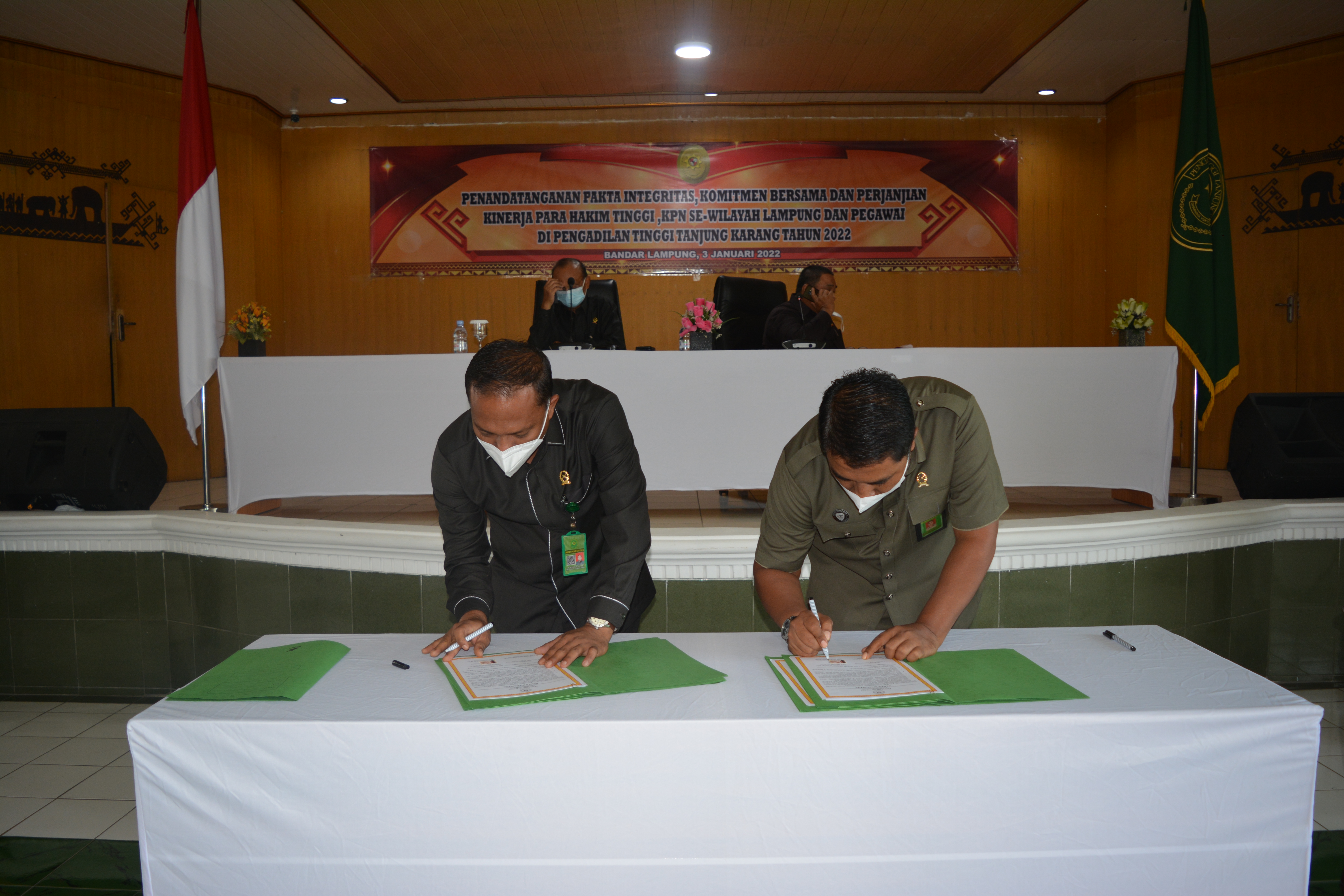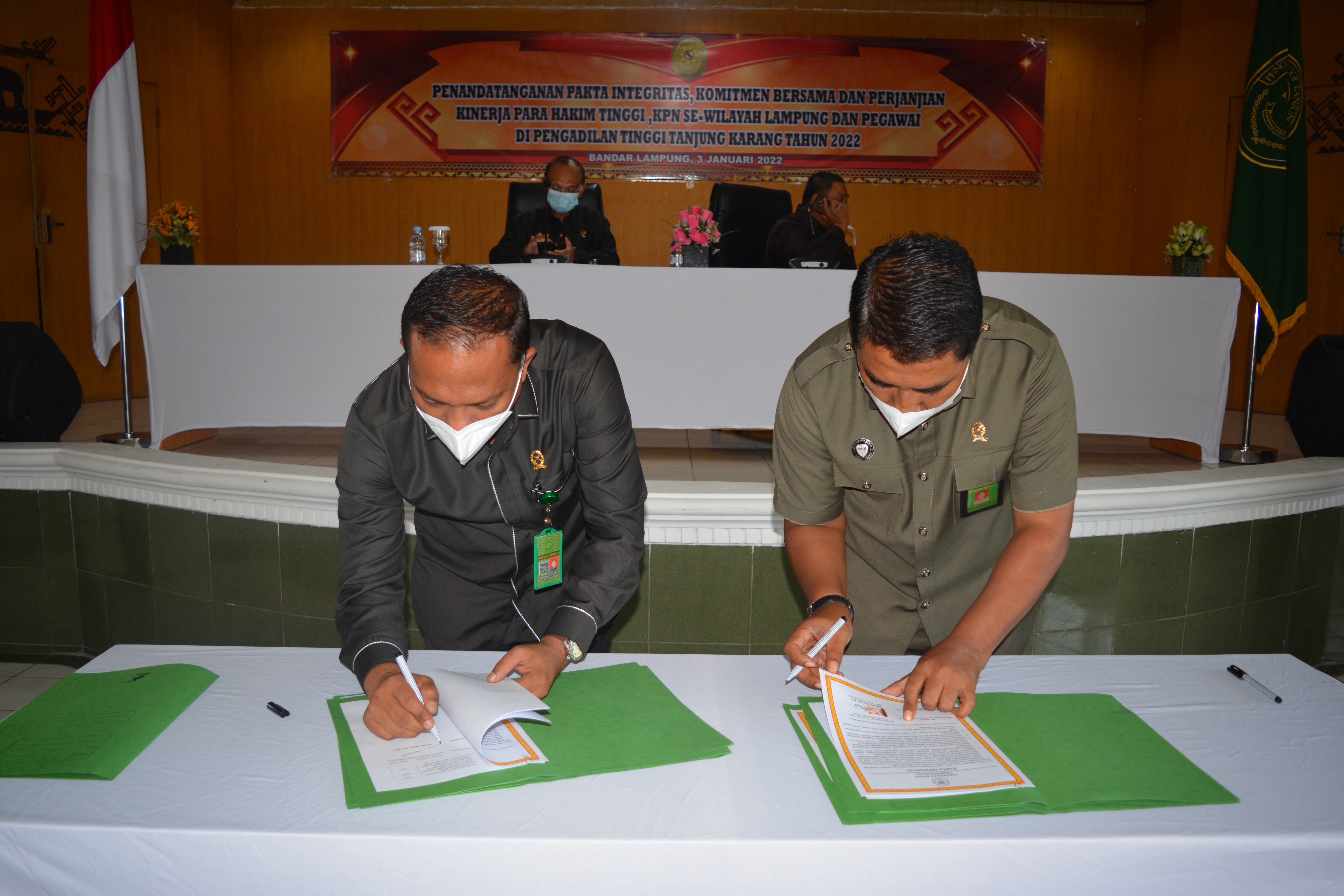 Tanjung Karang, 04 Januari 2022| Pada hari Selasa tanggal 04 Januari 2022, Bertempat di Ruang Rapat Pengadilan Tinggi Tanjung Karang melaksanakan Penandatanganan Pakta Integritas, Perjanjian Kinerja, Ikrar dan Komitmen Bersama Tahun 2022. Penandatanganan Pakta Integritas dan Perjanjian Kinerja Tahun 2022 oleh para Ketua Pengadilan Negeri Sewilkum PT Tanjungkarang dipimpin langsung oleh Ketua Pengadilan Tinggi Tanjungkarang Dr. MOCHAMAD DJOKO, S.H., M.Hum. Kegiatan ini berjalan dengan khidmat. Kegiatan ini merupakan agenda setiap awal tahun untuk mengingatkan dan mempertegas kembali janji atau komitmen dalam melaksanakan tugas, menjaga integritas, dan tanggung jawab dalam pencapaian kinerja.