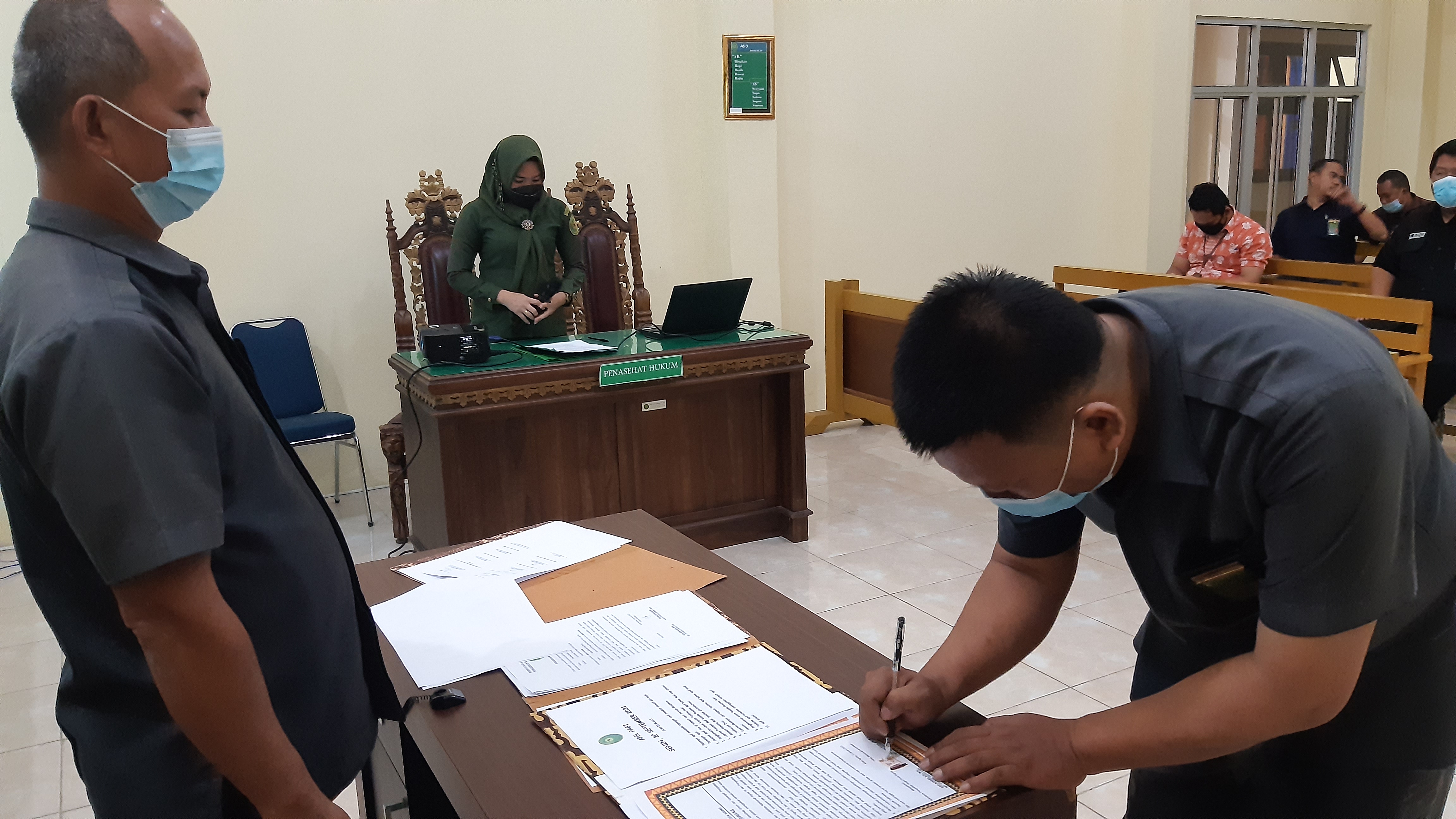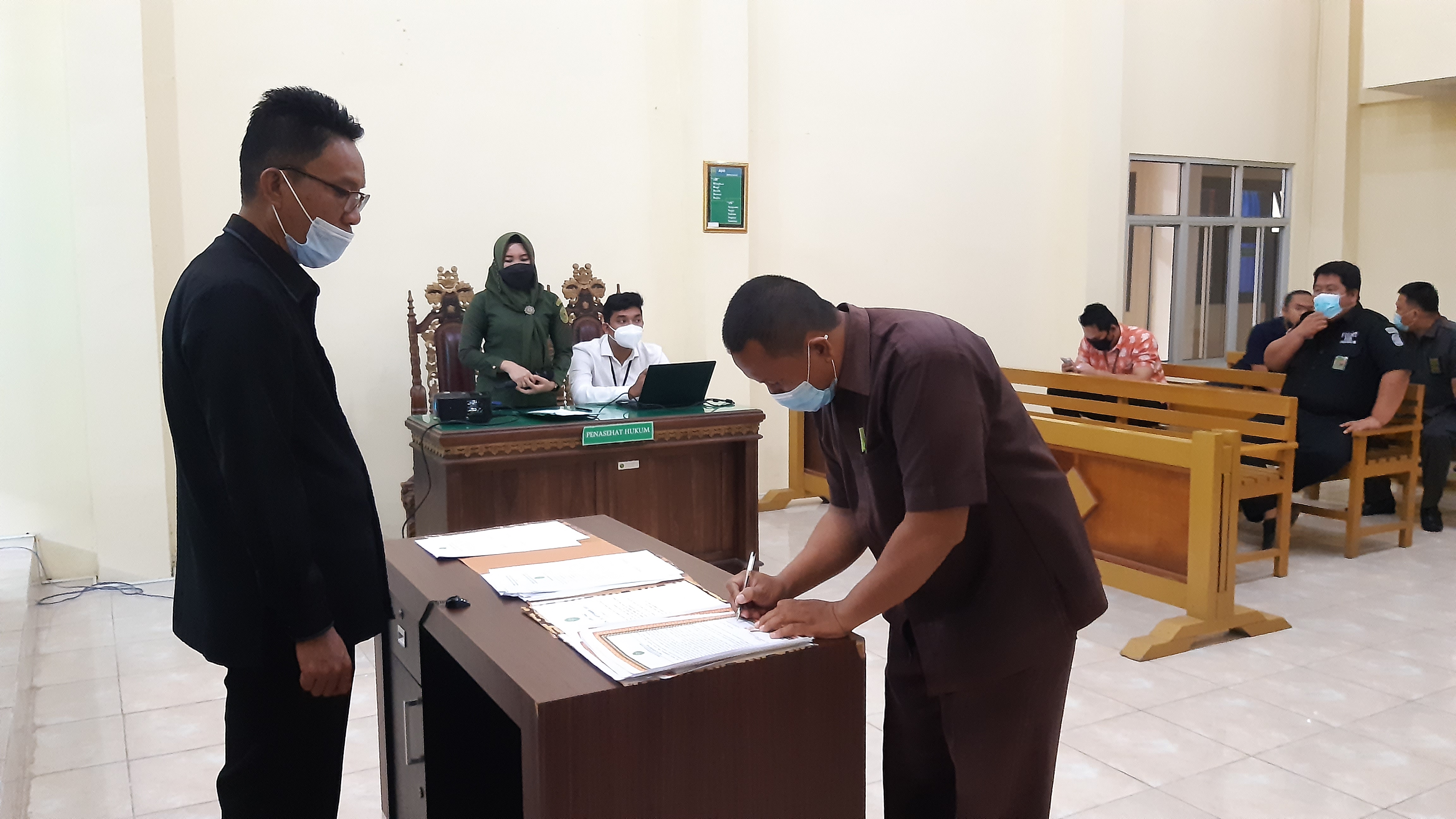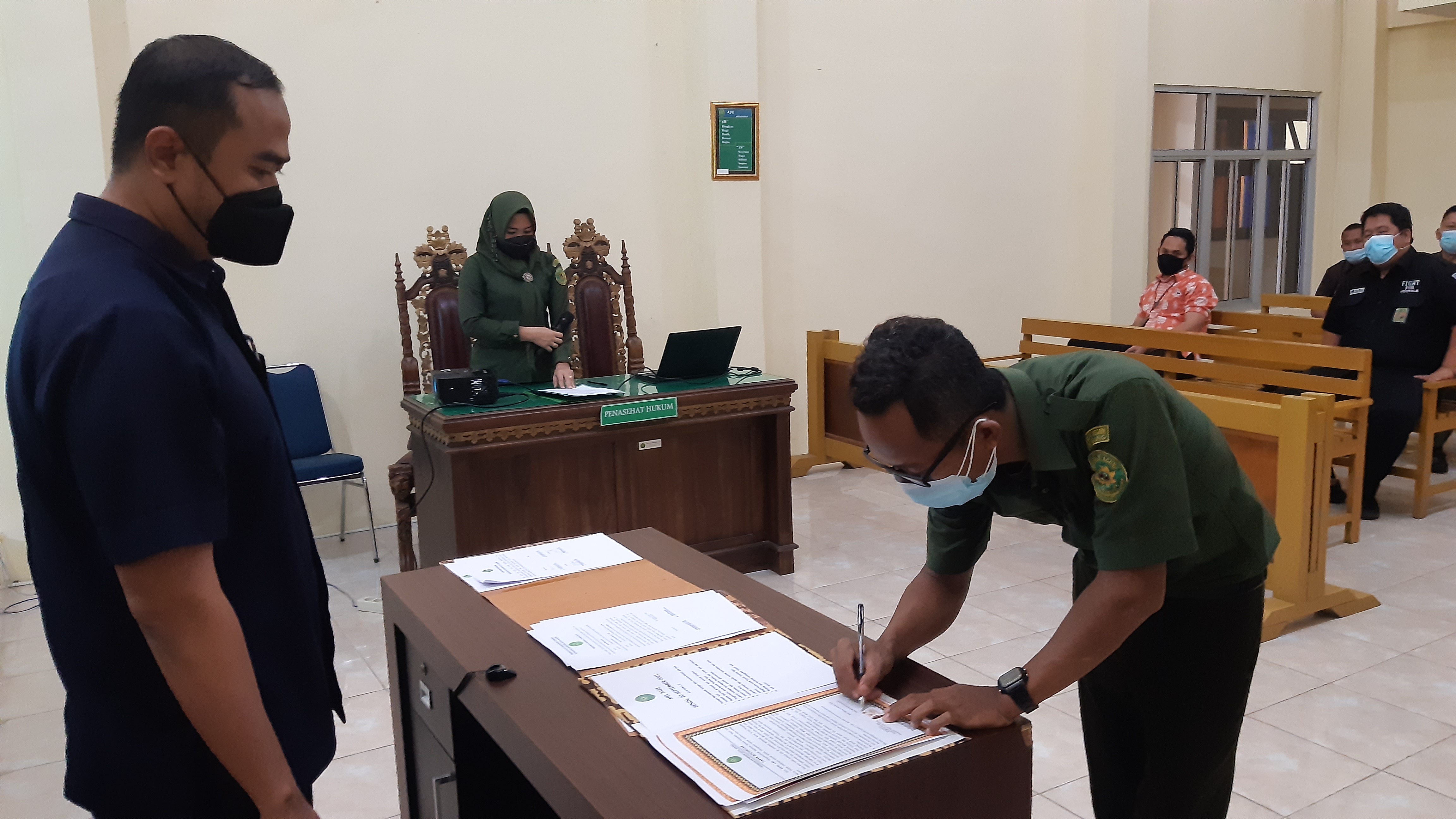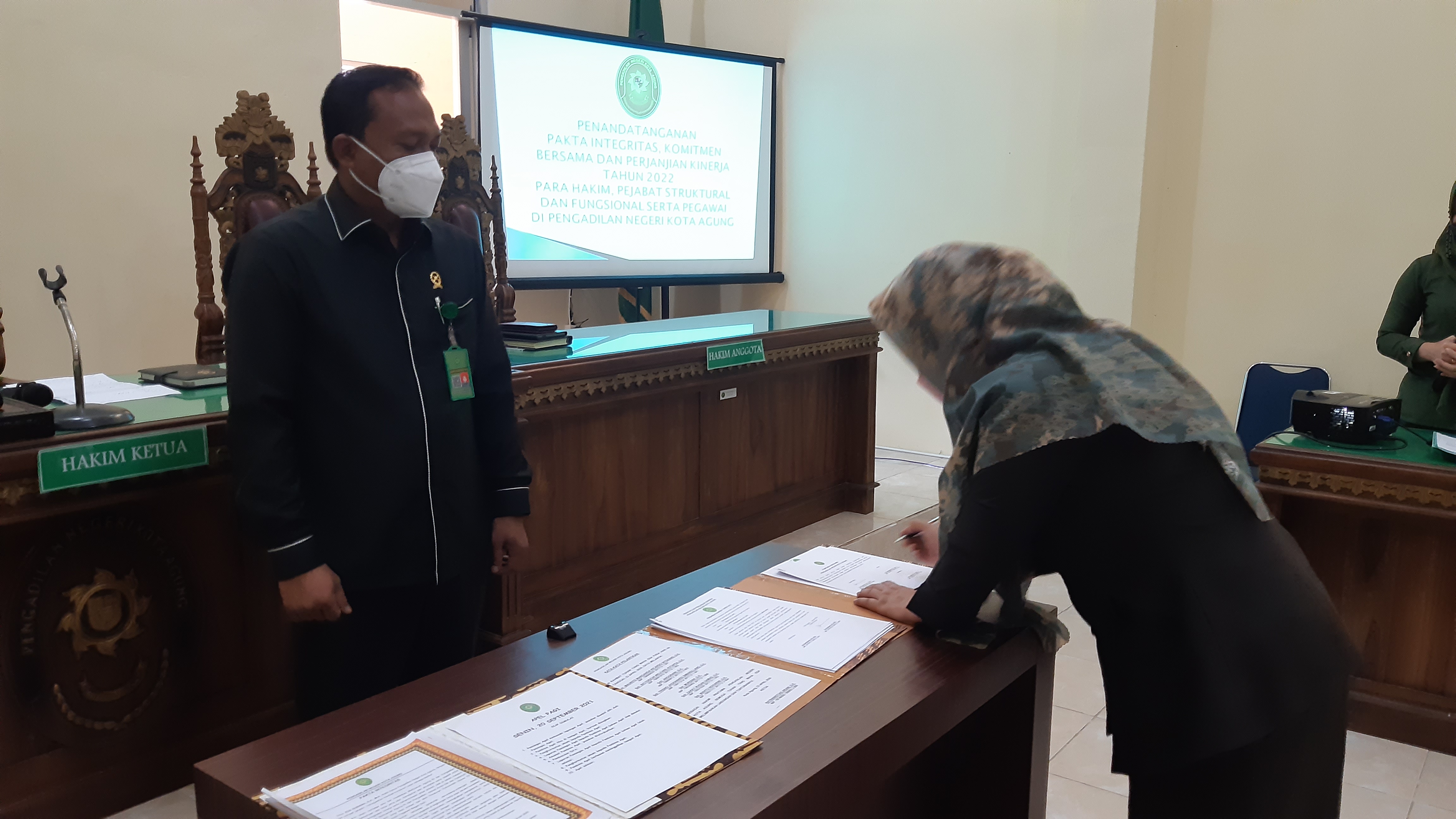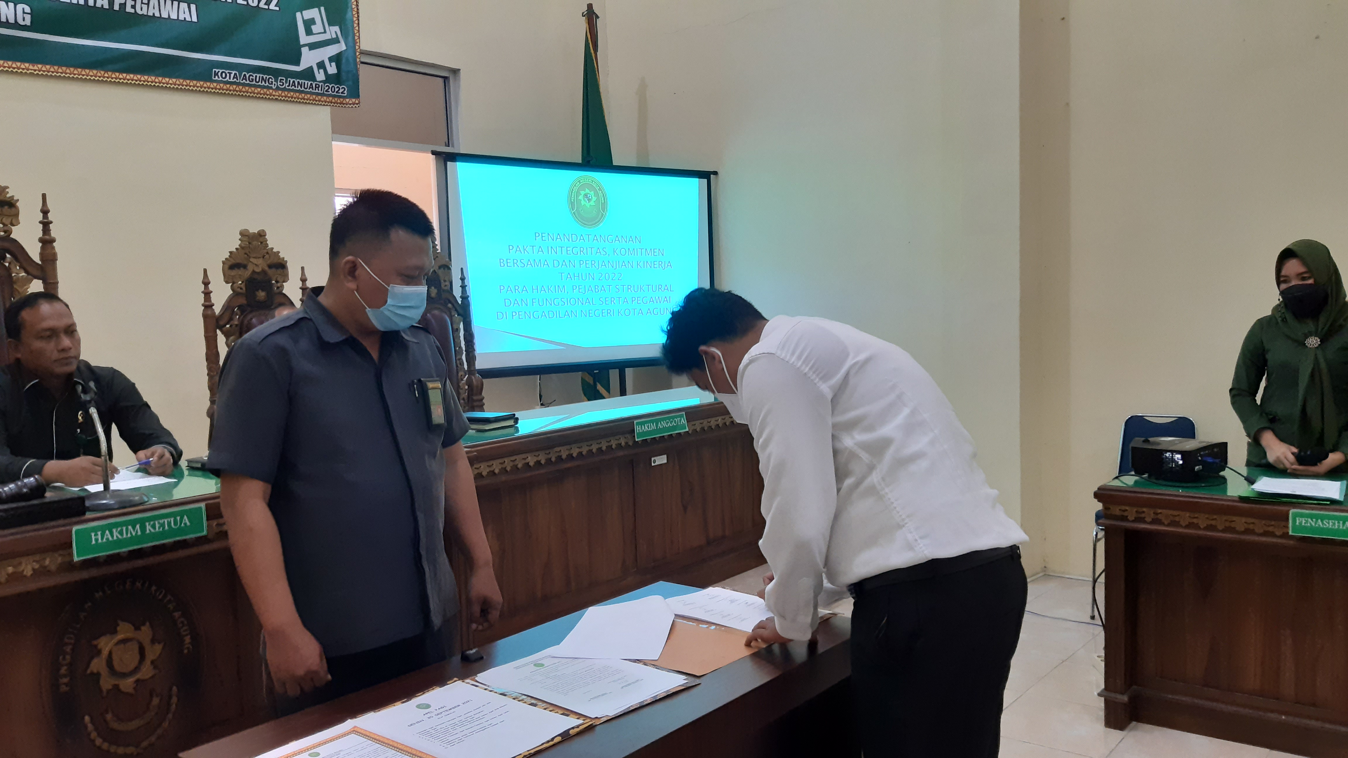 Kota Agung, 05 Januari 2022| Pada hari Rabu tanggal 05 Januari 2022, Bertempat di Ruang Sidang Utama Pengadilan Negeri Kota Agung melaksanakan Penandatanganan Pakta Integritas, Perjanjian Kinerja, Ikrar dan Komitmen Bersama Tahun 2022. Penandatanganan Pakta Integritas dan Perjanjian Kinerja Tahun 2022 oleh seluruh Hakim, Bagian Kepaniteraan dan Kesekretariatan Pengadilan Negeri Kota Agung dipimpin langsung oleh Ketua Pengadilan Negeri Kota Agung Bapak Ari Qurniawan, S.H., M.H. Kegiatan ini berjalan dengan khidmat. Kegiatan ini merupakan agenda setiap awal tahun untuk mengingatkan dan mempertegas kembali janji atau komitmen dalam melaksanakan tugas, menjaga integritas, dan tanggung jawab dalam pencapaian kinerja.