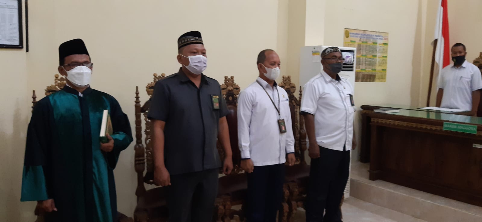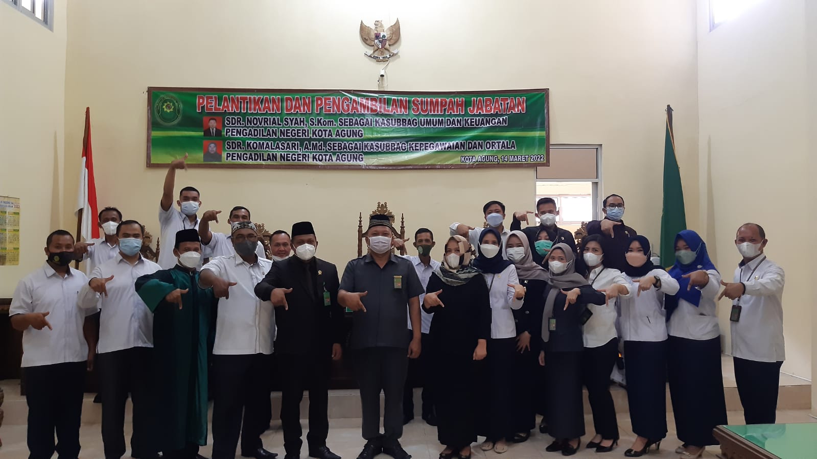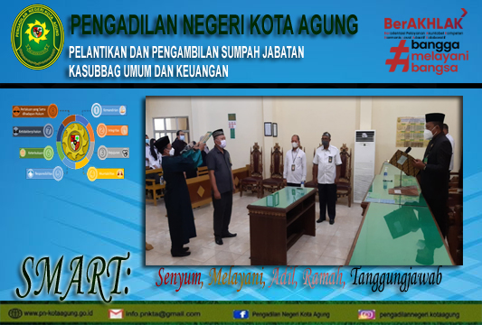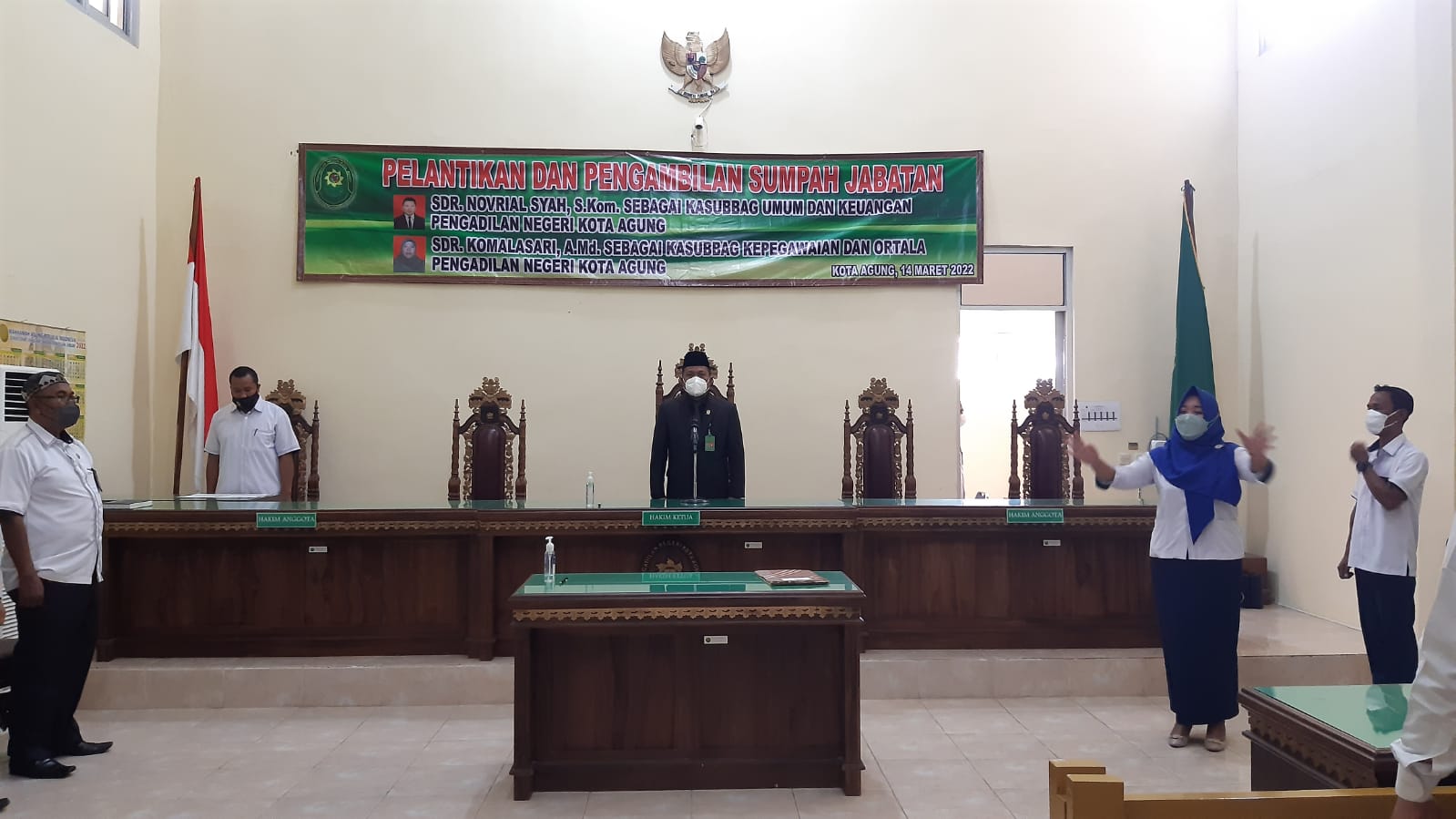 Kota Agung, 14 Maret 2022 | Bertempat di Ruang Sidang Utama Pengadilan Negeri Kota Agung Pada Hari Senin 14 Maret 2022 , Ketua Pengadilan Negeri Kota Agung Bapak Ari Qurniawan, S.H., M.H. melantik dan mengambil sumpah jabatan, Bapak. Novrial Syah, S.Kom sebagai Kasubbag Umum dan Keuangan Pengadilan Negeri Kota Agung Kelas II, Acara diawali dengan pembacaan surat keputusan Sekretaris Mahkamah Agung RI, Kemudian dilakukan pengambilan sumpah jabatan Kasubbag Umum dan Keuangan Pengadilan Negeri Kota Agung Kelas II, oleh Ketua Pengadilan Negeri Kota Agung Selanjutnya penandatanganan berita acara serta pengambilan sumpah jabatan dan pakta integritas. Ketua Pengadilan Negeri Kota Agung Kelas II Bapak Ari Qurniawan, S.H., M.H. memberikan beberapa kata sambutan salah satunya agar dalam menjalankan tugas dan tanggung jawab jabatan yang di berikan dengan baik. lalu dilanjutkan dengan acara foto bersama. Acara berlangsung dengan tetap memperhatikan Protokol Kesehatan.