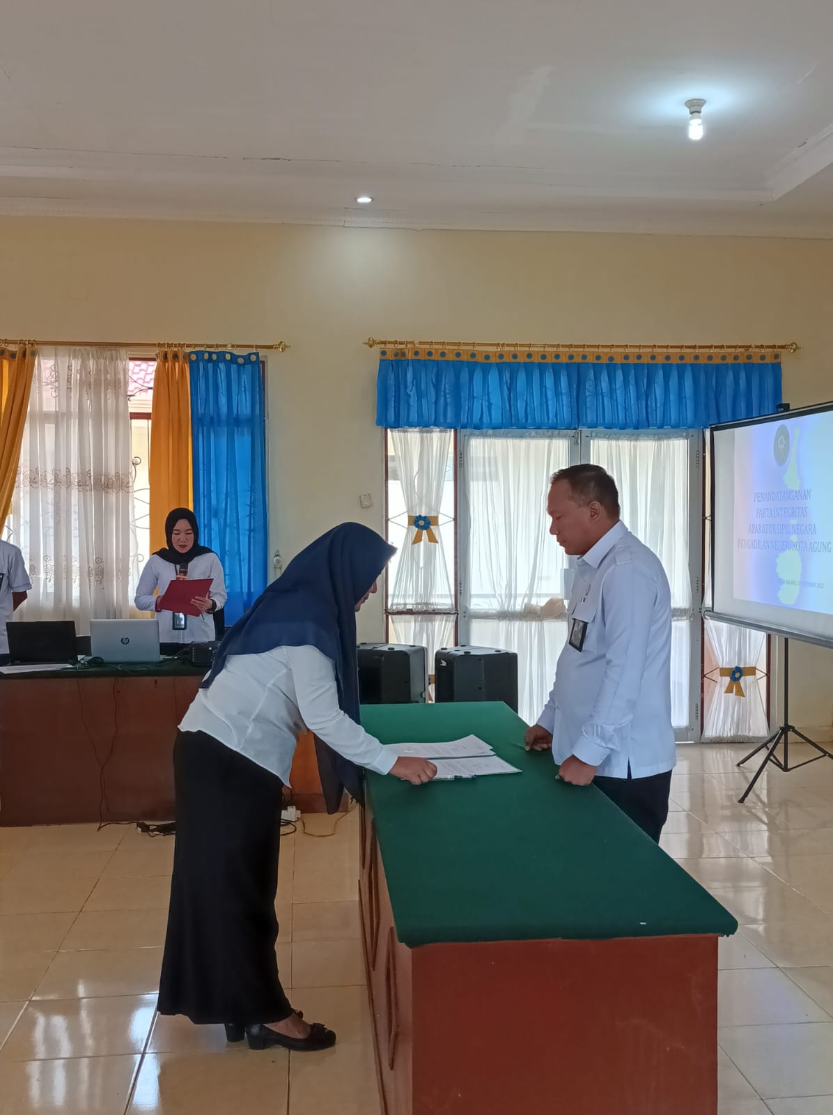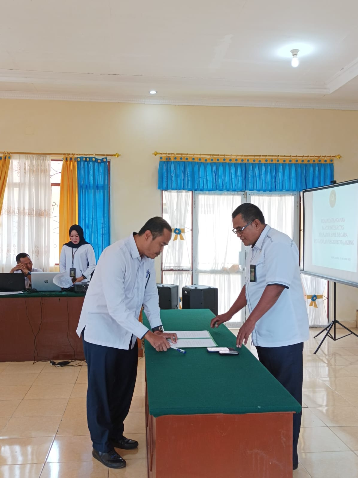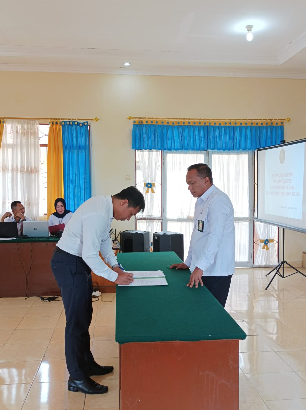 Kota Agung, 10 Oktober 2022 | Pada Tanggal 10 Oktober 2022 Pada hari senin jam 09:00 bertempat di Aula Pengadilan Negeri Kota Agung dilaksanakan Penandatangan Pakta Integritas Tahun 2022, dipimpin langsung oleh Ketua Pengadilan Negeri Kota Agung YM. Ari Qurniawan, S.H., M.H diikuti oleh Wakil Ketua Pengadilan Negeri Kota Agung, Sekretaris, Panitera Para Hakim dan Pejabat Struktural dan Fungsional Pengadilan Negeri Kota Agung.