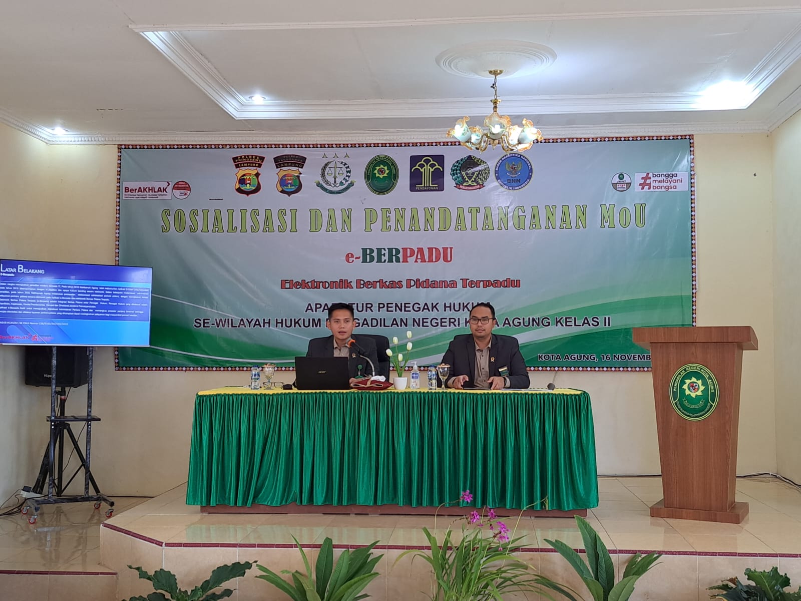 Kota Agung, 16 November 2022 | Pada hari Rabu Tanggal 16 November 2022 diadakan sosialisasi eksternal E-Berpadu kepada seluruh APH di wilayah hukum Pengadilan Negeri Kota Agung Kelas II. Aplikasi Elektronik Berkas Pidana Terpadu (E-Berpadu) adalah sistem pengelolaan berkas pidana terpadu secara elektronik dan terintegrasi khusus antara lembaga peradilan di bawah Mahkamah Agung dan instansi penegak hukum lainnya untuk pertukaran berkas pidana guna mengurangi penanganan berkas fisik secara manual (paperless) sehingga cepat dan efisien. Dalam sambutannya YM Ketua Pengadilan Negeri Ari Qurniawan, S.H., M.H menerangkan bahwa Dengan diluncurkan aplikasi E-Berpadu ini maka pertukaran data maupun informasi seperti perpanjangan penahanan dari pihak kepolisian, izin besuk oleh yang dilaksanakan oleh lapas, pelimpahan berkas perkara dari jpu, serta pertukaran informasi antar instansi dari dan ke Pengadilan Negeri Kelas II Kota Agung Kabupaten Tanggamus dapat dilaksanakan melalui aplikasi E-Berpadu. Usai sambutannya undangan yang hadir menandatangani nota kesepahaman (MoU) dengan Pengadilan Negeri Kota agung sebagai bentuk komitmen dukungan dalam penggunaan dan pengembangan Aplikasi E-Berpadu. Seusai mendatangani nota kesepahaman maka dilanjutkan dengan sosialisasi teknis mengenai aplikasi E-Berpadu yang dipandu oleh YM. Bpk. Zakky Ikhsan Samad, S.H., M.H. dan YM. Bpk. Trisno Jhohannes Simanullang, S.H. Hakim Pengadilan Negeri Kota Agung dan Operator IT bidang Kepaniteraan Bpk. Sapri, A.Md.