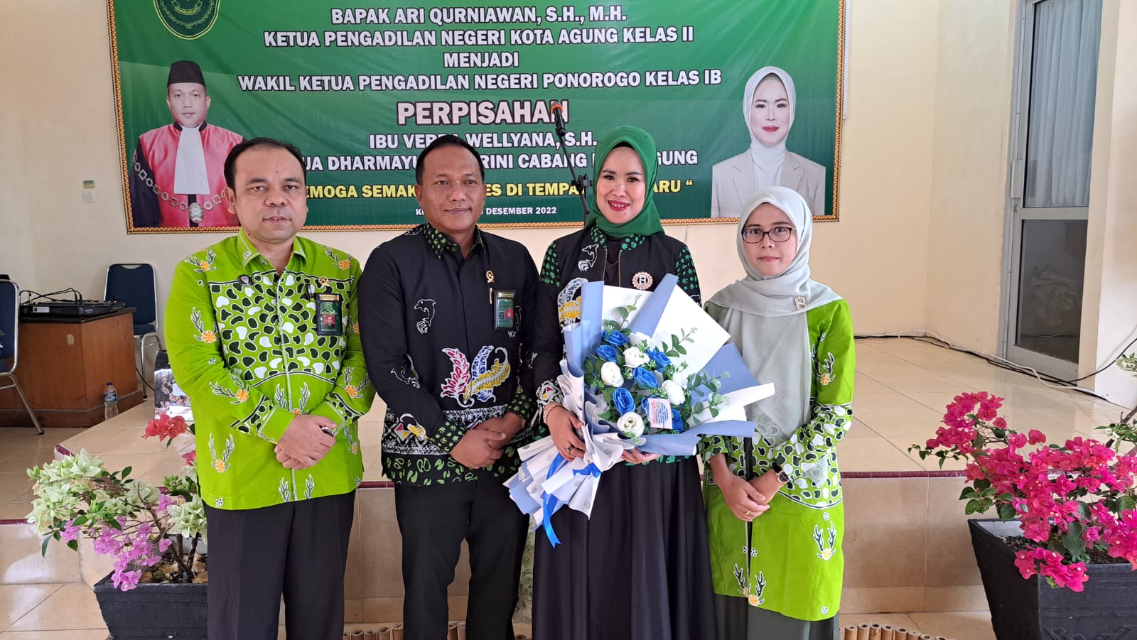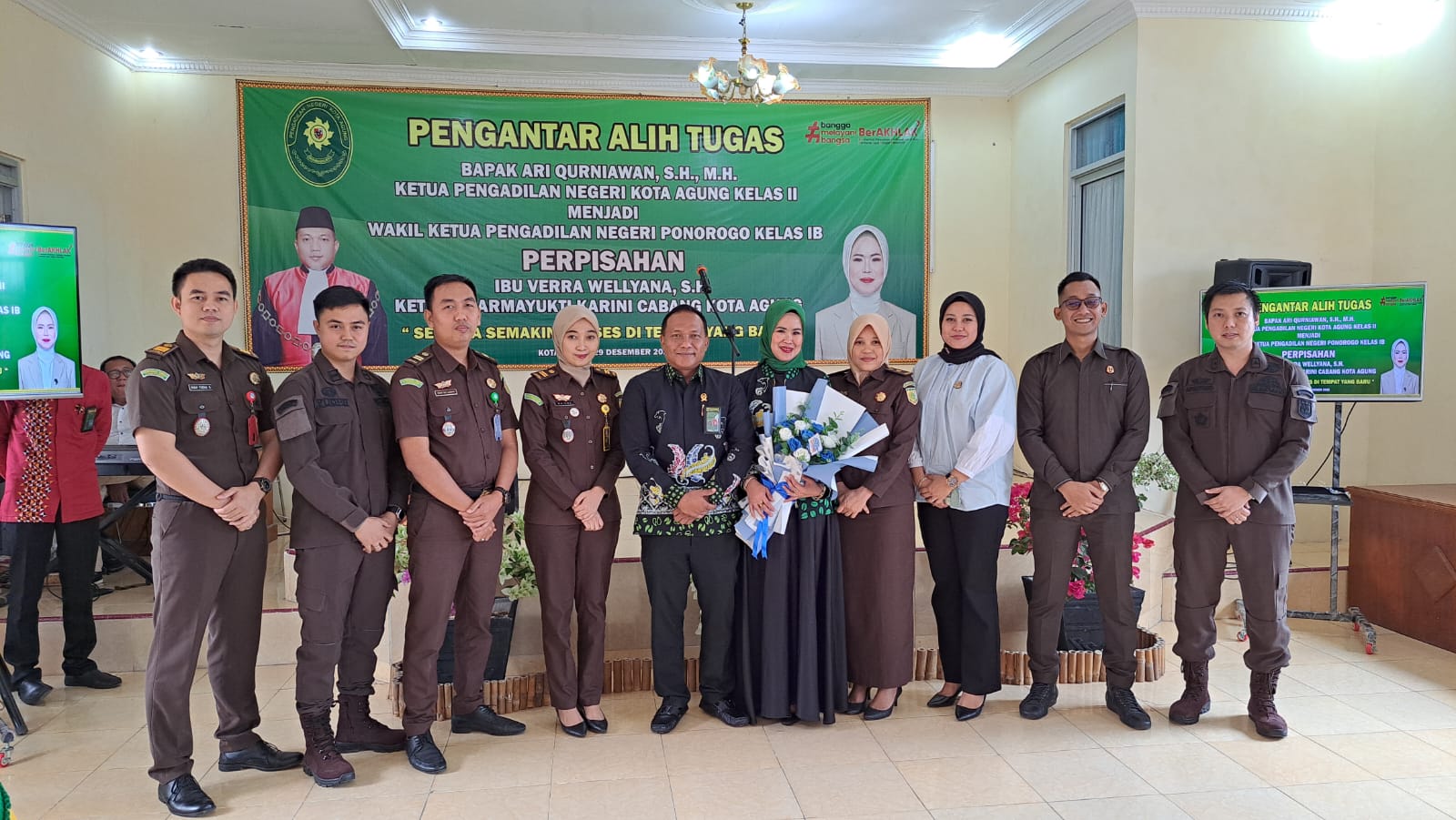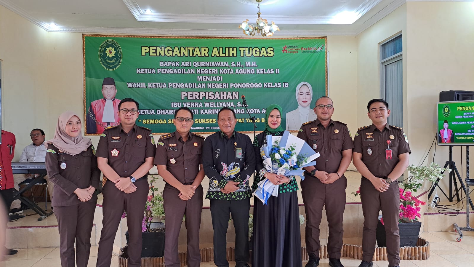 Kota Agung, 29 Desember 2022 | Pada Hari Kamis, 29 Desember 2022 bertempat di ruang Aula Pengadilan Negeri Kota Agung kelas II diselenggarakan acara pengantar alih tugas Ketua Pengadilan Negeri Kota Agung Bapak Ari Qurniawan, S.H., M.H. beralih tugas menjadi Wakil Ketua Pengadilan Negeri Ponorogo kelas IB. Keluarga besar Pengadilan Negeri Kota Agung kelas II mengucapkan terima kasih banyak atas segala jasa Bapak Ketua selama menjadi Ketua Pengadilan Negeri Kota Agung kelas II semoga selalu sukses ditempat yang baru. Acara ditutup dengan pemberian cinderamata oleh para hadirin dan ditutup dengan foto bersama.