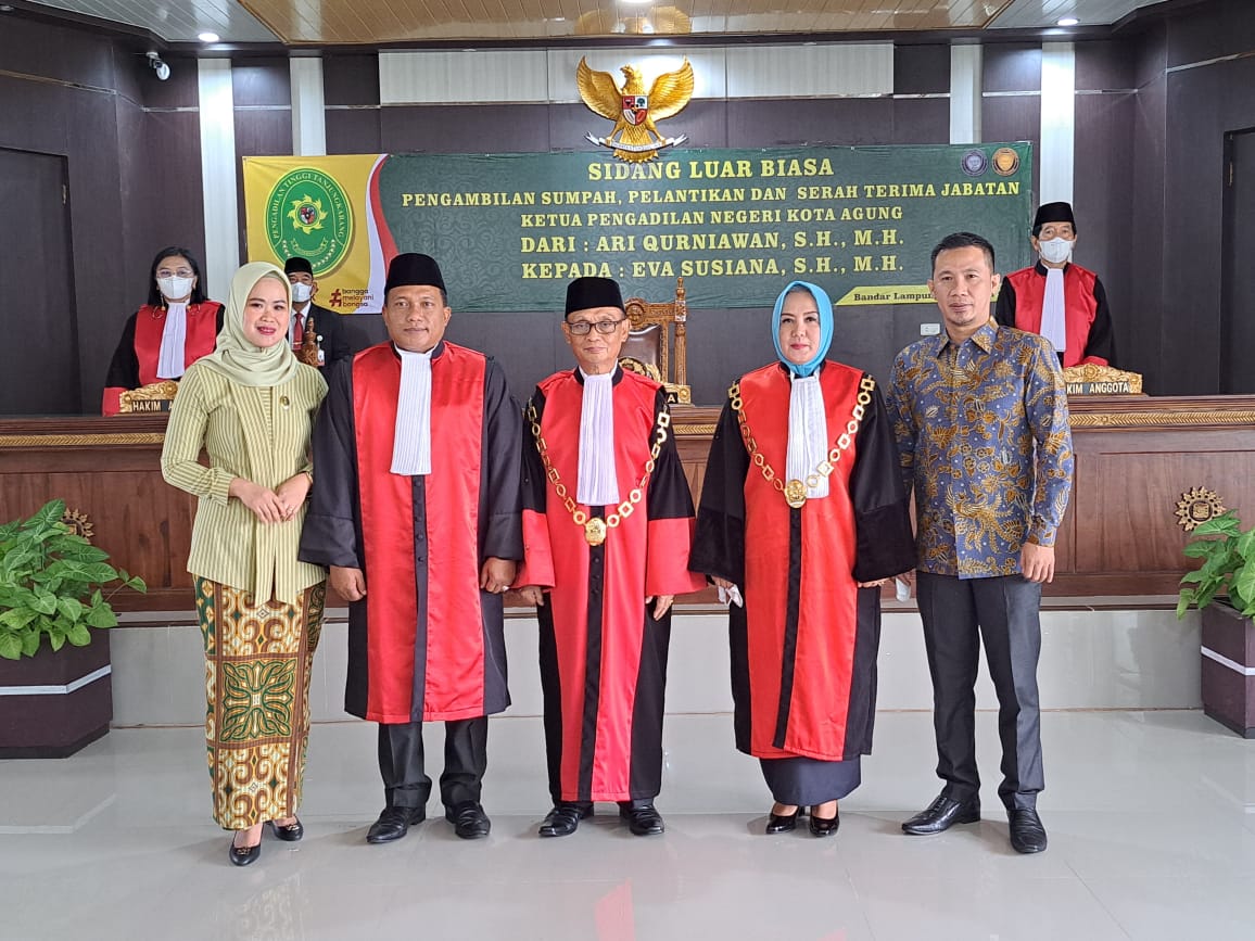 Prosesi serah terima jabatan dan pelantikan Ketua Pengadilan Negeri Kota Agung dipimpin oleh Ketua Pengadilan Tinggi Tanjungkarang, YM Bapak Dr. Mochamad Djoko, S.H., M.Hum. Prosesi diawali dengan pengambilan sumpah jabatan Ketua Pengadilan Negeri Kota Agung kepada Ibu Eva Susiana, S.H., M.H selaku Ketua Pengadilan Negeri Kota Agung yang baru. Usai pengambilan sumpah jabatan, prosesi dilanjutkan dengan serah terima jabatan Ketua Pengadilan Negeri Kota Agung dari pejabat sebelumnya yaitu Bapak Ari Qurniawan, S.H., M.H. kepada Ketua yang baru, Ibu Eva Susiana, S.H., M.H.