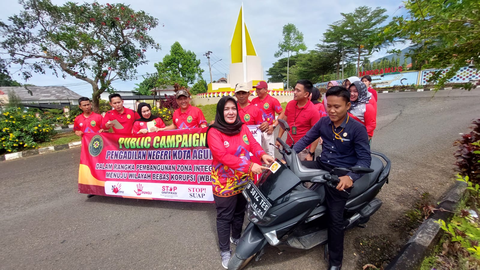 Kota Agung, 14 Februari 2023 | Dalam rangka mewujudkan zona integritas menuju WBK/WBBM maka Pengadilan Negeri Kota Agung Kelas II dipimpin oleh YM Ibu Ketua Pengadilan Negeri Kota Agung Eva Susiana, S.H., M.H. dan YM Bapak Wakil Ketua Pengadilan Negeri Kota Agung Nugraha Medica Prakasa, S.H., M.H. melakukan aksi nyata yaitu public campaign. Seluruh aparatur Pengadilan Negeri Kota Agung turut ke lingkungan komplek Pemda Tanggamus untuk membagikan brosur zona integritas dan stiker stop gratifikasi dan korupsi sebagai wujud ketegasan seluruh aparatur Pengadilan Negeri Kota Agung mempunyai perasaan yang sama dalam membangun Pengadilan Negeri Kota Agung yang berintegritas dan juga memberi edukasi kepada masyarakat sekitar.