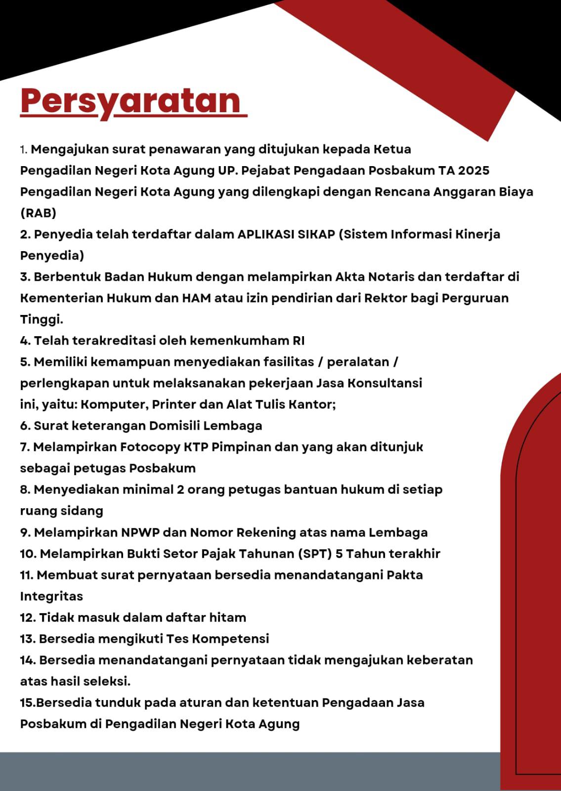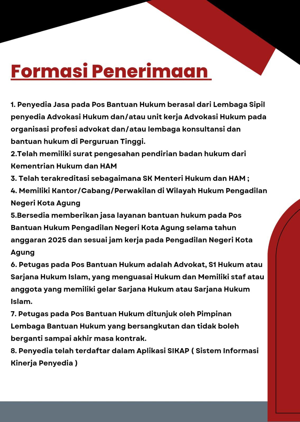 PENGUMUMAN SELEKSI CALON PENYEDIA LAYANAN POS BANTUAN HUKUM PADA PENGADILAN NEGERI KOTA AGUNG KELAS II TAHUN ANGGARAN 2025