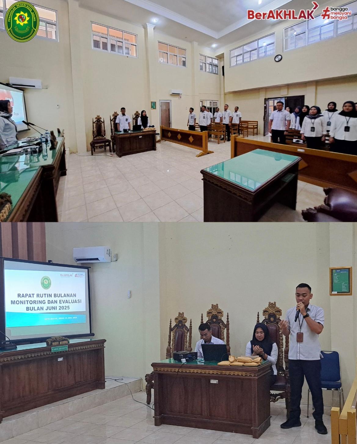 Pengadilan Negeri Kota Agung menyelenggarakan Rapat Bulanan, Bulan Juni dan Monitoring Evaluasi (Monev) Kinerja bertempat di Ruang Sidang Utama. Rapat ini dipimpin langsung oleh Ketua Pengadilan Negeri Kota Agung, Ibu Ita Denie Setiyawaty, S.H., M.H. Kegiatan ini dihadiri oleh para hakim, panitera, sekretaris, pejabat struktural dan fungsional, staf, PPNPN, serta TKS.
