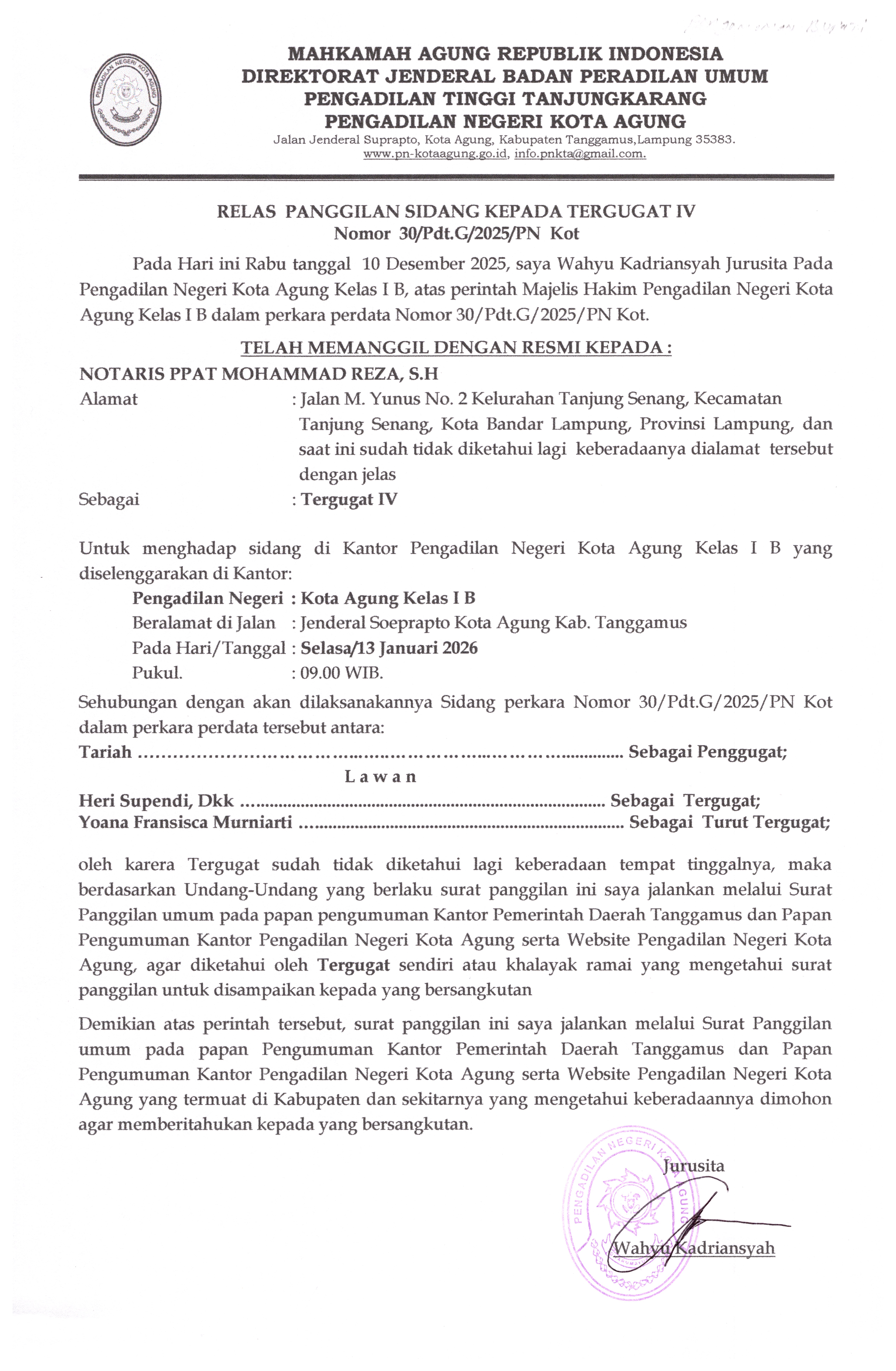 RELAS PANGGILAN SIDANG KEPADA TERGUGAT Nomor 30/Pdt.G/2025/PN Kot an. notaris muhammad reza dan RELAS PANGGILAN SIDANG KEPADA TERGUGAT Nomor 30/Pdt.G/2025/PN Kot an. turut tergugat yoana fransisca murniati