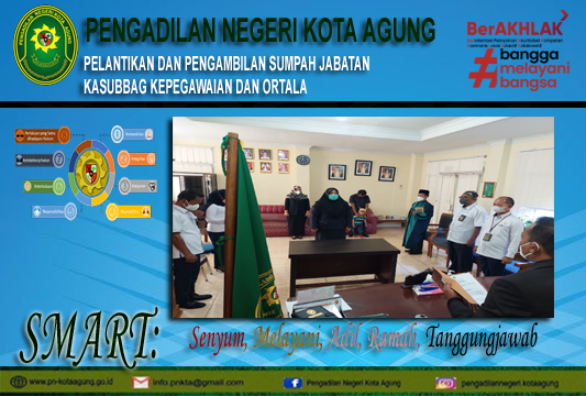 Kota Agung, 14 Maret 2022 | Bertempat di Ruang Sidang Utama Pengadilan Negeri Kota Agung Pada Hari Senin 14 Maret 2022 , Ketua Pengadilan Negeri Kota Agung Bapak Ari Qurniawan, S.H., M.H. melantik dan mengambil sumpah jabatan, Ibu. Komala Sari, A.Md sebagai Kasubbag Kepegawaian dan Ortala Pengadilan Negeri Kota Agung Kelas II, Acara diawali dengan pembacaan surat keputusan Sekretaris Mahkamah Agung RI, Kemudian dilakukan pengambilan sumpah jabatan Kasubbag Kepegawaian dan Ortala Pengadilan Negeri Kota Agung Kelas II, oleh Ketua Pengadilan Negeri Kota Agung Selanjutnya penandatanganan berita acara serta pengambilan sumpah jabatan dan pakta integritas. Ketua Pengadilan Negeri Kota Agung Kelas II Bapak Ari Qurniawan, S.H., M.H. memberikan beberapa kata sambutan salah satunya agar dalam menjalankan tugas dan tanggung jawab jabatan yang di berikan dengan baik. lalu dilanjutkan dengan acara foto bersama. Acara berlangsung dengan tetap memperhatikan Protokol Kesehatan.