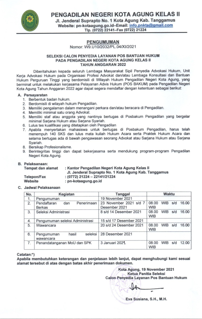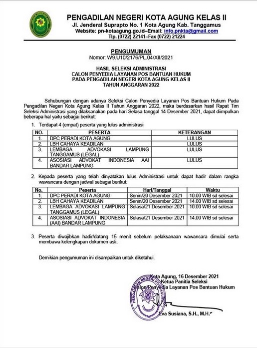 Kota Agung, 16 Desember 2021| Pada hari Kamis tanggal 16 Desember 2021, Pengadilan Negeri Kota Agung mengikuti Sosialisasi PNBP Teknils sewilayah Hukum Pengadilan Tinggi Tanjungkarang secara virtual bertempat di aula Pengadilan Negeri Kota Agung kelas II yang diikuti oleh Ibu Eva Susiana, S.H., M.N. selaku Wakil Ketua Pengadilan Negeri Kota Agung, Bapak Muhasan Pandri, S.H., M.H., selaku Panitera Pengadilan Negeri Kota Agung, Bapak Bambang Setiawan, S.H., selaku Panitera Muda Perdata Pengadilan Negeri Kota Agung, Ibu Epita Indarwati, S.H., selaku Bendahara Penerimaan Pengadilan Negeri Kota Agung, dan Bapak Wahyu Kadriansyah, A.Md. Selaku selaku Kasir Pengadilan Negeri Kota Agung.