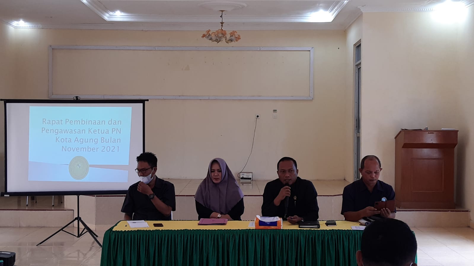 Kota Agung, 8 Desember 2021| Dalam rangka pembinaan dan pengawasan di Pengadilan Negeri Kota Agung pada hari Rabu, 8 Desember 2021 telah dilaksanakan rapat rutin bulanan antara Pimpinan Pengadilan Negeri Kota Agung dengan seluruh Hakim, Panitera, Sekretaris, Panmud, Kasubbag, Panitera Penganti, Juru Sita, dan seluruh staf pada Pengadilan Negeri Kota Agung yang bertempat di ruang Sidang Utama Pengadilan Negeri Kota Agung. Rapat bulanan bulan November dipimpin langsung oleh Ketua Pengadilan Negeri Kota Agung Ari Qurniawan, S.H., M.H. sekaligus menjadi pemberi materi di rapat bulanan. Acara diawali dengan menyanyikan lagu Indonesia Raya berikut Hymne Mahkamah Agung, dan Doa yang dibacakan oleh Sdr. Agung Dwi Winarno. Selanjutnya, Hakim pengawas bidang membacakan laporan di bulan November mulai dari Kepaniteraan Perdata, Hukum, Pidana, Subbag Umum Keuangan, Ortala, dan PTIP. dan juga dalam agenda rapat bulanan ini juga melakukan Monitoring dan Evaluasi Sistem Informasi Penelusuran Perkara (SIPP) oleh Ketua Pengadilan Negeri Kota Agung Bapak Ari Qurniawan, S.H., M.H. dan acara ditutup dengan pemberian reward petugas PTSP terbaik periode Bulan November 2021 yang diberikan kepada Sdr. Bareza Saputra