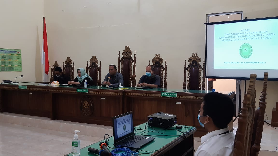 Kota Agung, 28 September 2021|Pada hari Selasa 28 September 2021 Pengadilan Negeri Kota Agung melaksanakan Rapat pembahasan Surveilance Akreditasi Penjaminan Mutu (APM) Pengadilan Negeri Kota Agung. Dalam rangka Rapat pembahasan surveilans Akreditasi Penjaminan Mutu dilaksanakan bertempat di Ruang Sidang Cakra Pengadilan Negeri Kota Agung pada pukul 08.30 WIB s/d selesai. Pada rapat ini Ketua Pengadilan Negeri Kota Agung sekaligus sebagai pemberi materi YM Bapak Ari Qurniawan,S.H. M.H bersama Ibu Wakil Ketua Pengadilan Negeri Kota Agung YM Ibu Eva Susiana, S.H., M.H memberi arahan dan masukan pada rapat kali ini, dan diharapkan warga Pengadilan Negeri Kota Agung dapat melaksanakan segala kewajiban dan arahan sesuai instruksi Pemberi Materi. Pada rapat pembahasan surveilans Akreditasi Penjaminan Mutu Pengadilan Negeri Kota Agung tetap melakukan protokol kesehatan virus Covid-19.