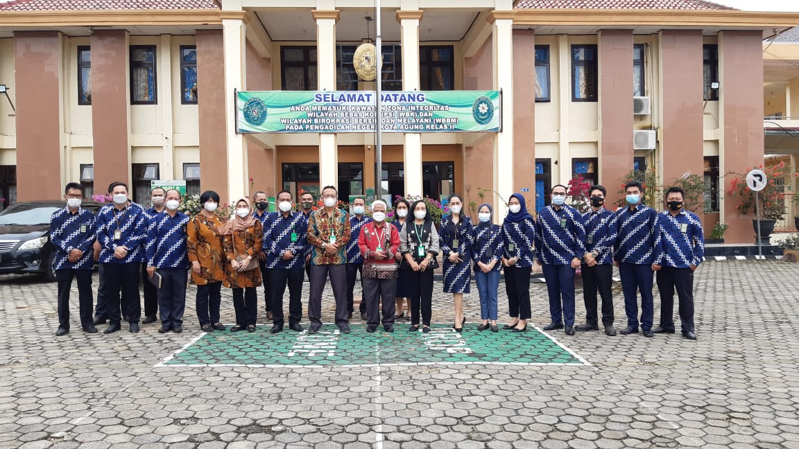Kota Agung, 23-24 Juni 2021| Rombongan Hakim Tinggi Pengawas Daerah dari Pengadilan Tinggi Tanjungkarang yang terdiri dari Bpk. H. Aksir, S.H., M.H. (Hakim Tinggi), Bpk. Gatot Susanto, S.H., M.H. (Hakim Tinggi), Ibu. Eni Indriyartini, S.H., M.H (Hakim Tinggi), Ibu. Maryati, SH., M.H (Panitera Muda Hukum) dan Ibu. Tika Indah Apriyani Susilo, S.Kom., M.M (Kasubbag Rencana Program dan Anggaran) tiba di Kota Agung pada hari Rabu tanggal 23 Juni 2021 dan disambut oleh Keluarga Besar Pengadilan Negeri Kota Agung dengan diawali prosedur protokol pencegahan penyebaran Covid-19, yaitu pengecekan suhu badan dengan thermogun infrared dan cuci tangan. . Agenda kedatangan rombongan Hakim Tinggi pengawas daerah PT Tanjungkarang untuk melaksanakan agenda Pengawasan Rutin di Pengadilan Negeri Kota Agung.