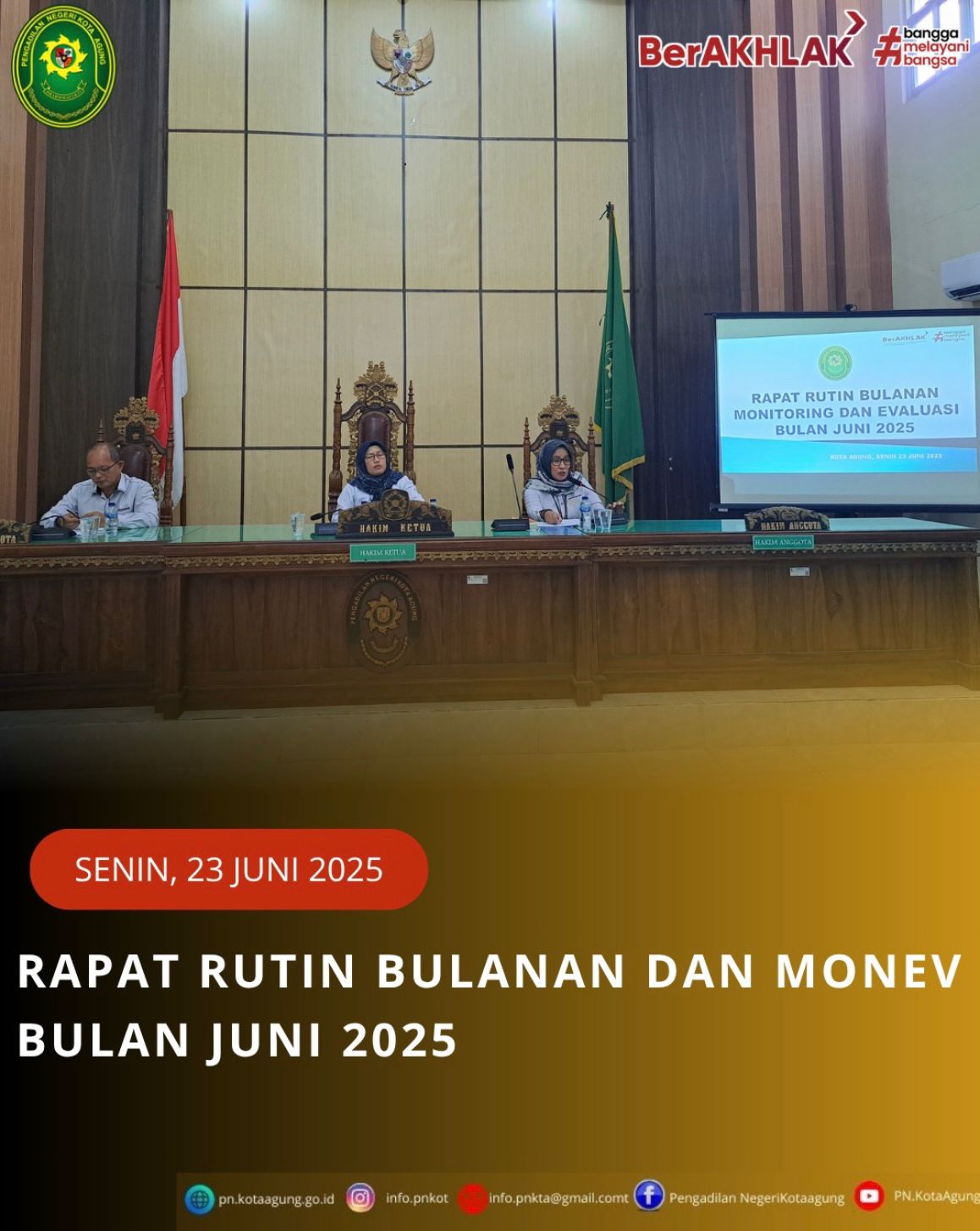 Pengadilan Negeri Kota Agung menyelenggarakan Rapat Bulanan, Bulan Juni dan Monitoring Evaluasi (Monev) Kinerja bertempat di Ruang Sidang Utama. Rapat ini dipimpin langsung oleh Ketua Pengadilan Negeri Kota Agung, Ibu Ita Denie Setiyawaty, S.H., M.H. Kegiatan ini dihadiri oleh para hakim, panitera, sekretaris, pejabat struktural dan fungsional, staf, PPNPN, serta TKS.