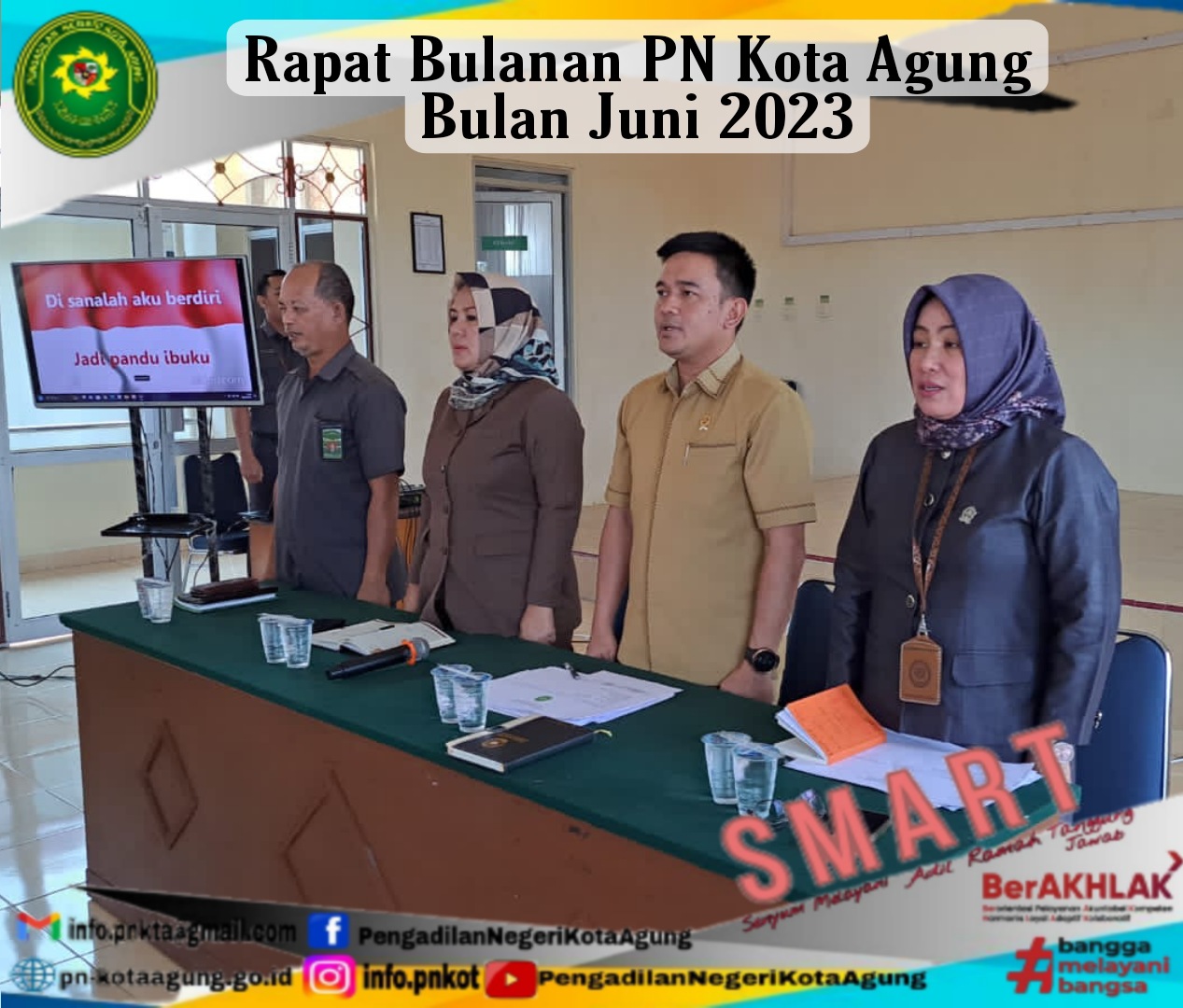 Kota Agung, 18 Juli 2023 | Kota Agung, 18 Juli 2023 | Pengadilan Negeri Kota Agung melaksanakan Rapat Bulanan, Bulan Juni 2023 pada hari Selasa, 18 Juli 2023 telah dilaksanakan rapat rutin bulanan antara Pimpinan Pengadilan Negeri Kota Agung dengan seluruh Hakim, Panitera, Sekretaris, Panmud, Kasubbag, Panitera Penganti, Juru Sita, dan seluruh staf pada Pengadilan Negeri Kota Agung yang bertempat di ruang Aula Pengadilan Negeri Kota Agung. Rapat bulanan bulan Juni dipimpin langsung oleh Ketua Pengadilan Negeri Kota Agung YM Ibu Eva Susiana, S.H., M.H. sekaligus menjadi pemberi materi di rapat bulanan. Acara diawali dengan menyanyikan lagu Indonesia Raya berikut Hymne Mahkamah Agung, dan Doa yang dibacakan oleh Bapak M.Dimas Prasetyo. Selanjutnya, Hakim pengawas bidang membacakan laporan di bulan Januari mulai dari Kepaniteraan Perdata, Hukum, Pidana, Subbag Umum Keuangan, Ortala, dan PTIP. Dalam pembinaan nya Ketua Pengadilan Negeri Kota Agung Ibu Eva Susiana menyampaikan, agar rapat bulanan di tahun 2023 menjadi sarana evaluasi bagi seluruh bidang sehingga di tahun yang baru dapat semakin meningkatkan kinerjanya. Tak lupa juga seluruh pegawai dipersilahkan berdiskusi, bertanya, atau pun memberikan solusi apabila menemukan kesulitan dalam pekerjaan, dan juga beberapa pegawai mengajukan pendapat serta inovasi untuk kemajuan Pengadilan Negeri Kota Agung.