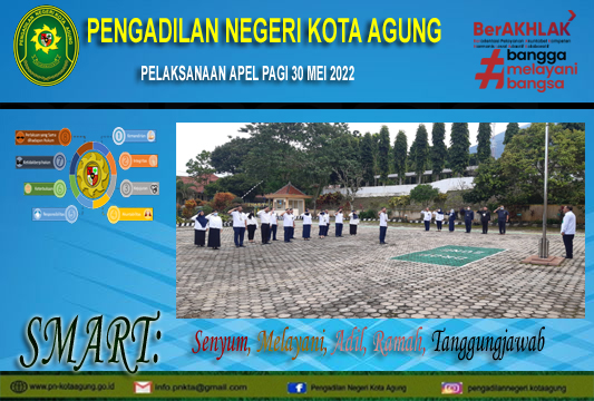 Kota Agung, 30 Mei 2022 | Pada hari Senin 30 Mei 2022 Pengadilan Negeri Kota Agung melaksanakan kegiatan rutin Apel Pagi, Apel pagi dilaksanakan dan bertempat di Halaman Kantor Pengadilan Negeri Kota Agung dengan menjalankan protokol kesehatan demi mencegah penyebaran virus Covid-19. Pada kesempatan kali ini, Apel dipimpin Langsung oleh Ketua Pengadilan Negeri Kota Agung, Bpk. Ari Qurniawan, SH., M.H dan Pemimpin Apel Bpk. Sapri, A.Md. Dalam apel pagi tersebut Ketua Pengadilan Negeri Kota Agung dan juga selaku pembina apel pagi mengingatkan agar tetap semangat dalam menjalankan pekerjaan dan tetap meningkatkan kinerja dalam bidang masing-masing, tidak lupa Ketua Pengadilan Negeri Kota Agung juga mengingatkan untuk tetap menjaga kedisiplinan kerja demi meningkatkan pelayanan publik yang maksimal terutama para pencari keadilan pada Kabupaten Tanggamus dan Kabupaten Pringsewu. Demikian laporan apel pagi senin 30 mei 2022 Pengadilan Negeri Kota Agung.