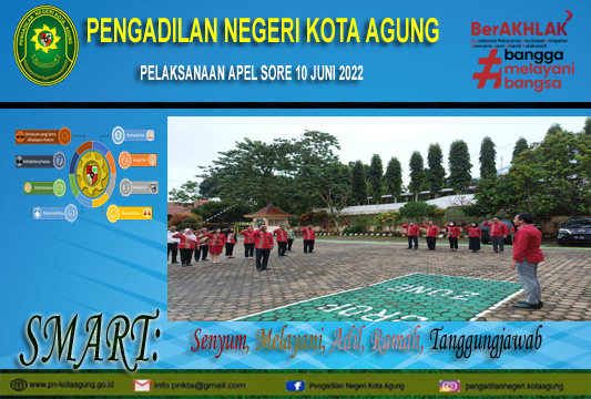 Kota Agung, 10 Juni 2022 | Pada hari Jumat 10 Juni 2022 Pengadilan Negeri Kota Agung melaksanakan kegiatan rutin Apel Sore, Apel sore dilaksanakan dan bertempat di Halaman Kantor Pengadilan Negeri Kota Agung dengan menjalankan protokol kesehatan demi mencegah penyebaran virus Covid-19. Pada kesempatan kali ini, Apel dipimpin Langsung oleh Hakim Pengadilan Negeri Kota Agung, Bpk. Murdian, S.H. dan Pemimpin Apel Bpk. Broto Susilo. Dalam apel sore tersebut Bpk. Murdian, S.H. selaku pembina apel sore mengingatkan agar tetap menjaga kedisipilinan kerja dan juga tetap menjunjung tinggi moto Pengadilan Negeri Kota Agung. SMART : Senyum, Melayani, Adil, Ramah, Tanggungjawab. Demikian laporan apel sore jumat 10 Juni 2022 Pengadilan Negeri Kota Agung.