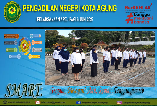 Kota Agung, 06 Juni 2022 | Pada hari Senin 06 Juni 2022 Pengadilan Negeri Kota Agung melaksanakan kegiatan rutin Apel Pagi, Apel pagi dilaksanakan dan bertempat di Halaman Kantor Pengadilan Negeri Kota Agung dengan menjalankan protokol kesehatan demi mencegah penyebaran virus Covid-19. Pada kesempatan kali ini, Apel dipimpin Langsung oleh Ketua Pengadilan Negeri Kota Agung, Bpk. Ari Qurniawan, SH., M.H dan Pemimpin Apel Bpk. Agus Rohman, S.H., M.H.. Dalam apel pagi tersebut Ketua Pengadilan Negeri Kota Agung dan juga selaku pembina apel pagi mengingatkan agar tetap semangat dalam menjalankan pekerjaan dan tetap meningkatkan kinerja dalam bidang masing-masing, tidak lupa Ketua Pengadilan Negeri Kota Agung juga mengingatkan untuk tetap menjaga kedisiplinan kerja demi meningkatkan pelayanan publik yang maksimal terutama para pencari keadilan pada Kabupaten Tanggamus dan Kabupaten Pringsewu. Demikian laporan apel pagi senin 06 Juni 2022 Pengadilan Negeri Kota Agung.