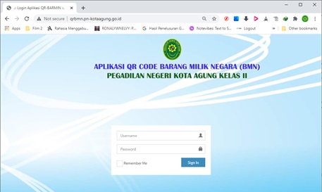 Aplikasi ini memfasilitasi pembuatan QR Code masing-masing data/item BMN di lingkungan Pengadilan Negeri Kota Agung, QR Code BMN bermanfaat guna menampilkan informasi masing-masing BMN yang terintegrasi dengan Website Pengadilan Negeri Kota Agung. Output dari aplikasi ini berupa Label BMN yang telah memiliki QRCode.