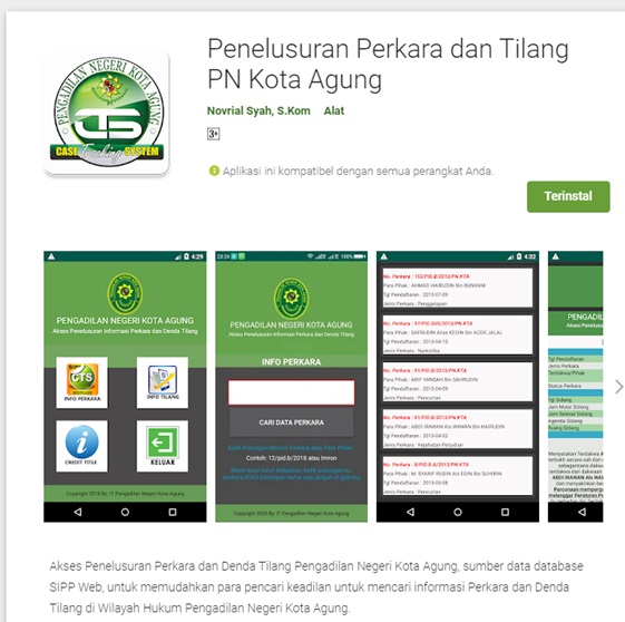 Aplikasi ini memfasiltasi pencarian data informasi perkara dan tilang dengan menggunakan smartphone, aplikasi ini dapat ddi download di playstore dan diinstal di android.